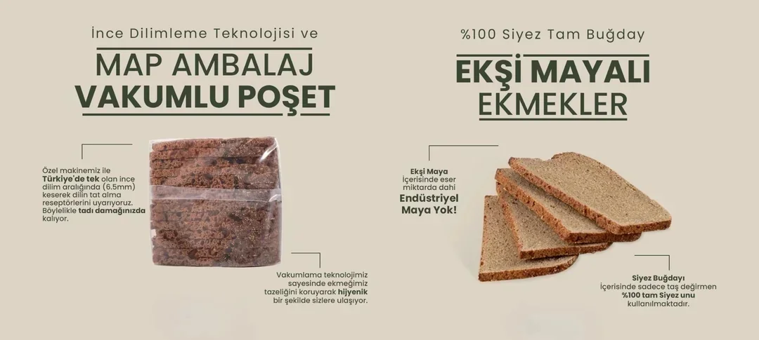 Bir ekmeğin oluşum süreci tohumla başlar. En iyi ekmek ise en saf tohumun doğru şekilde öğütülüp, en kaliteli malzemelerle ve benzersiz bir üretim yöntemiyle birleşmesi ile oluşur. Biz tüm bu süreçlerin üzerinde özenle çalışarak, Ar-Ge yaparak, eşsiz bir ekmek ortaya çıkarmayı başardık. Üstelik bunu hiçbir yapay, sentetik kimyasal sürece maruz bırakmadan doğal bir şekilde olması gerektiği gibi gerçekleştirdik. Dünyanın en saf buğdayı Siyez, üretim yerimizde bulunan taş değirmenimizde öğütülür, ambarımızda hijyenik, serin ve kuru yerde muhafaza edilir. Buradan üretim alanına sevk edilerek önceki hamurdan ayrılan ekşi maya ile birleşir. (endüstriyel ticari maya kullanmıyoruz) Uzun fermantasyon sürecinin ardından özel tasarım taş fırınımıza girer. Fırından çıktığında ise tam bir şifa kaynağı halini alarak sofralara sağlık ve mutluluk vermek için yola çıkar.